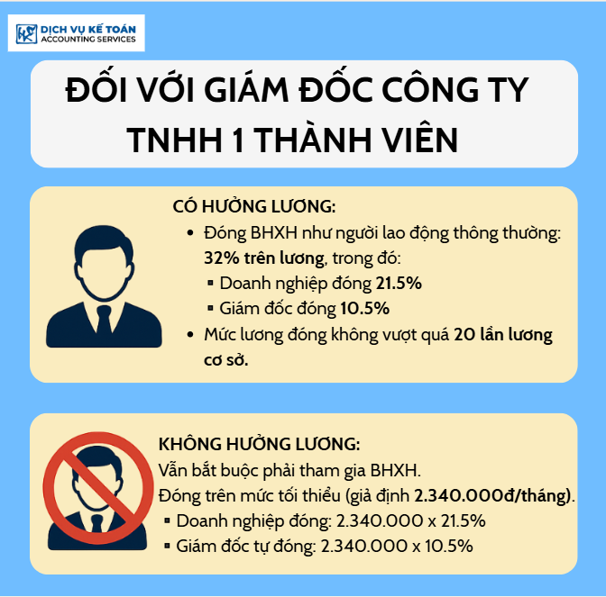 - Mức đóng này sẽ tương tự như người lao động bình thường (Tổng cộng 32% trên quỹ lương, trong đó doanh nghiệp đóng 21.5% và Giám đốc đóng 10.5%).