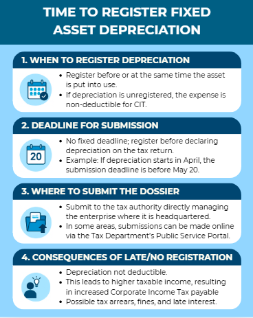 According to current regulations, businesses must register depreciation before starting depreciation or, at the latest, within the first tax declaration period in which depreciation expenses arise. In other words, registration must be done before or at the same time as the asset’s official use. If a business begins using an asset without registering the depreciation method, all depreciation expenses from that point onward will be disallowed as deductible costs for corporate income tax (CIT) purposes. Therefore, it is best to register depreciation immediately after recording the fixed asset in the accounting books to avoid missing the deadline.