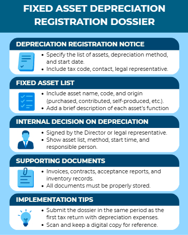 Recommendation: It is best to submit the depreciation registration dossier together with the first tax declaration period in which depreciation expenses arise. Additionally, businesses should scan and store digital copies in their internal system for easy reference and verification during future tax audits.