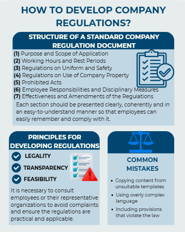 Additionally, when drafting the regulations, it is important to consult employees or their representative organizations (if any) to avoid complaints and ensure the rules can be effectively applied in practice.