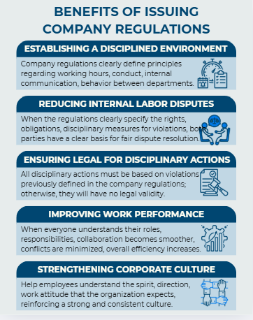 Issuing company regulations is not only a legal requirement for certain businesses but also brings significant practical benefits to corporate management and operations. A well-structured and transparent set of internal labor rules helps foster a positive corporate culture, a professional working environment, and reduces potential legal risks. Below are five key benefits that a company can gain from having a proper set of internal regulations.