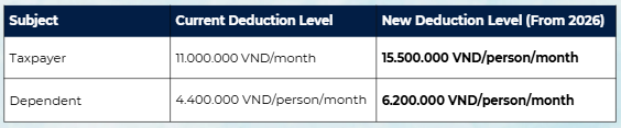 - For the taxpayer (Self-Exemption): The exemption level is officially raised from 11,000,000 VND/month to 15,500,000 VND/month. This increase of 4.5 million VND reflects the GDP growth and average per capita income during the 2020-2025 period.