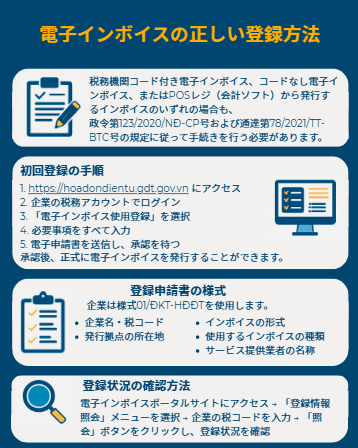 電子インボイスを合法的に使用するためには、企業および個人事業主は税務当局への登録手続きを完了することが義務付けられています。この登録は、単なる形式的な手続きではなく、インボイス発行を開始するための第一歩であり、同時に総税務局システムが認証コードを付与し、インボイスデータを管理するための法的根拠にもなります。税務機関コード付き電子インボイス、コードなし電子インボイス、または電子レジ(POS)発行型インボイスのいずれを使用する場合でも、政令123/2020/NĐ-CPおよび通達78/2021/TT-BTCで定められた手順に従う必要があります。