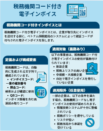 税務機関コード付き電子インボイスとは、企業が購入者へ送信する前に、総税務局のシステムによって認証コード(確認番号)が付与される電子インボイスを指します。この認証コードは一意の識別番号であり、インボイスの真正性・合法性・透明性を保証する役割を果たします。この形式のインボイスは、ベトナム国内の大多数の企業、特に中小企業や税務リスクの高い企業に対して義務付けられています。税務機関コード付きインボイスを使用することで、税務当局が売上を厳密に監視でき、不正請求や脱税を最大限に防止することが可能になります。