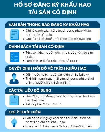 Gợi ý: Hồ sơ đăng ký khấu hao nên được gửi kèm theo kỳ khai báo thuế đầu tiên có phát sinh chi phí khấu hao. Ngoài ra, doanh nghiệp nên scan và lưu trữ bản mềm trên hệ thống để tiện tra cứu và đối chiếu trong các kỳ kiểm tra thuế.