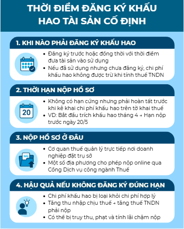 Theo quy định hiện hành, doanh nghiệp phải đăng ký khấu hao trước thời điểm bắt đầu trích khấu hao hoặc chậm nhất là trong kỳ kê khai thuế đầu tiên có phát sinh chi phí khấu hao. Tức là, việc đăng ký cần thực hiện trước hoặc đồng thời với thời điểm đưa tài sản vào sử dụng chính thức. Nếu doanh nghiệp đã đưa tài sản vào sử dụng nhưng chưa đăng ký phương pháp khấu hao, toàn bộ chi phí trích khấu hao từ thời điểm đó sẽ không được tính vào chi phí hợp lý khi tính thuế TNDN.