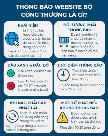 Thông báo website Bộ Công Thương là thủ tục bắt buộc đối với các doanh nghiệp, tổ chức hoặc cá nhân có sở hữu website bán hàng. Đây là hình thức khai báo thông tin với cơ quan quản lý nhà nước để xác nhận rằng website đang hoạt động hợp pháp trong lĩnh vực thương mại điện tử. Thủ tục này khác với việc đăng ký website – vốn áp dụng cho các nền tảng cho phép bên thứ ba bán hàng. Khi thông báo đúng hạn và đúng quy định, doanh nghiệp sẽ được cấp dấu xác nhận (dấu xanh), góp phần nâng cao uy tín và giảm thiểu rủi ro xử phạt.